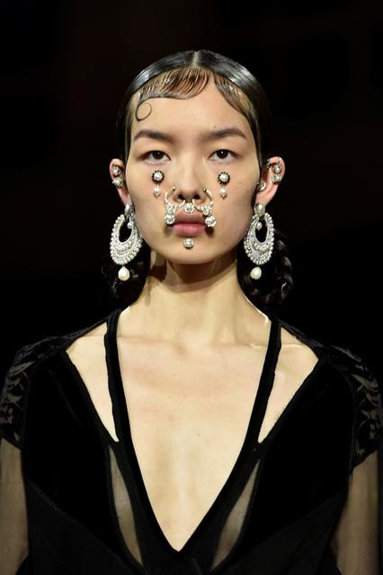 There has not been that many crazy beauty looks during Fashion Month. Crimped hair and mullets were two of the more daring looks. The Givenchy Fall 2015 show at Paris Fashion Week made up for all of the wearable beauty looks by sending models down the runway with multiple fake facial piercings and slicked baby hair “chola girl” hairstyles.